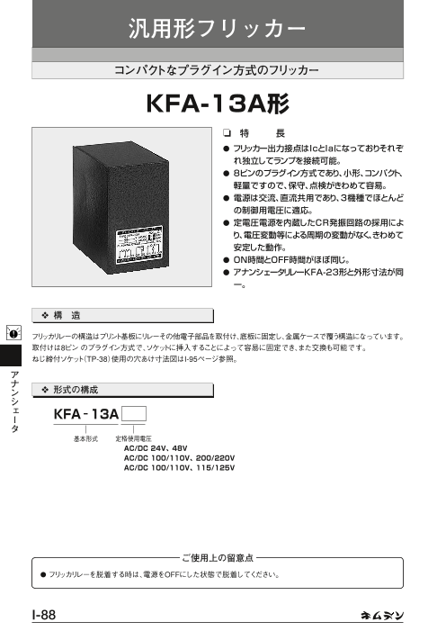◆フリッカー出力接点はIcとIaになっておりそれぞれ独立してランプを接続可能。 ◆8ピンのプラグイン方式であり、小形、コンパクト、軽量ですので、保守、点検がきわめて容易。 ◆電源は交流、直流共用であり、3機種でほとんどの制御用電圧に適応。 ◆定電圧...