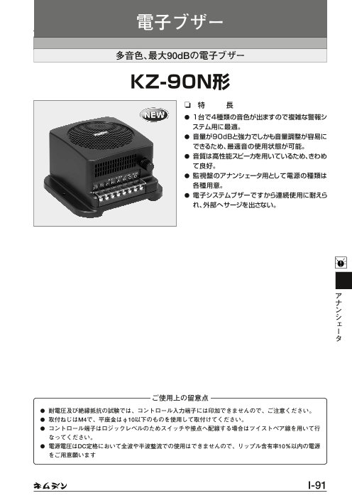 ◆1台で4種類の音色が出ますので複雑な警報システム用に最適。 ◆音量が90dBと強力でしかも音量調整が容易にできるため、最適音の使用状態が可能。 ◆音質は高性能スピーカを用いているため、きわめて良好。 ◆監視盤のアナンシェータ用として電源の種類は各...