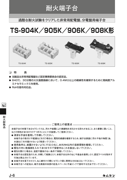 ◆当製品は非常用配電盤など認定業務委員会の認定品。 ◆840℃、30分間の火災温度曲線において、0.4MΩ以上の絶縁性を確保するために高純度アルミナセラミックスを使用。 ◆RoHS指令対応品。 ◆詳細はカタログをダウンロードしご覧いただくか、お...