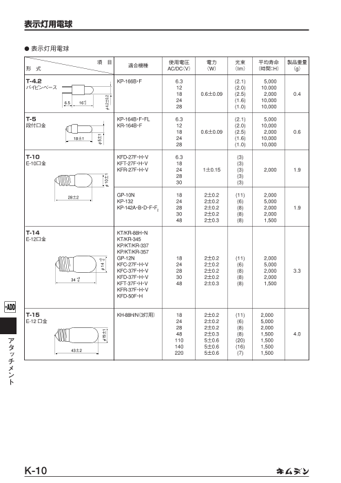 掲載製品 ・T-4.2 バイピンベース ・T-5 段付口金 ・T-10 E-10口金 ・T-14 E-12口金 ・T-15 E-12 口金 ・T-20 E-12口金 ・T-26 E-26 口金 ◆詳細はカタログをダウンロードしご覧いた...