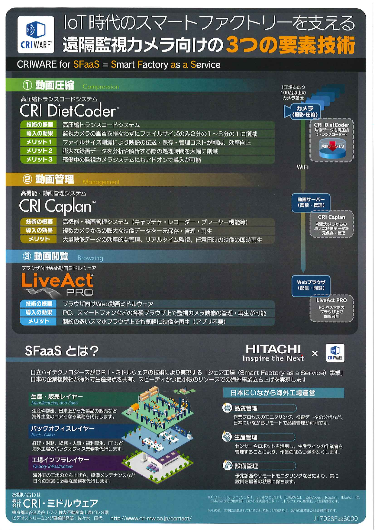 【掲載内容】 ・動画圧縮 高圧縮トランスコードシステム CRI DietCoder ・動画管理 高機能・動画管理システム CRI Caplan ・動画閲覧 ブラウザ向けWeb動画ミドルウェア LiveAct ・SFaaSとは?