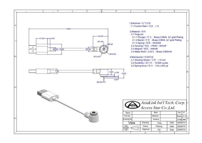 台湾 アジアリンク インターナショナル ポゴピン丸型磁気充電コネクタハーネス、モバ...