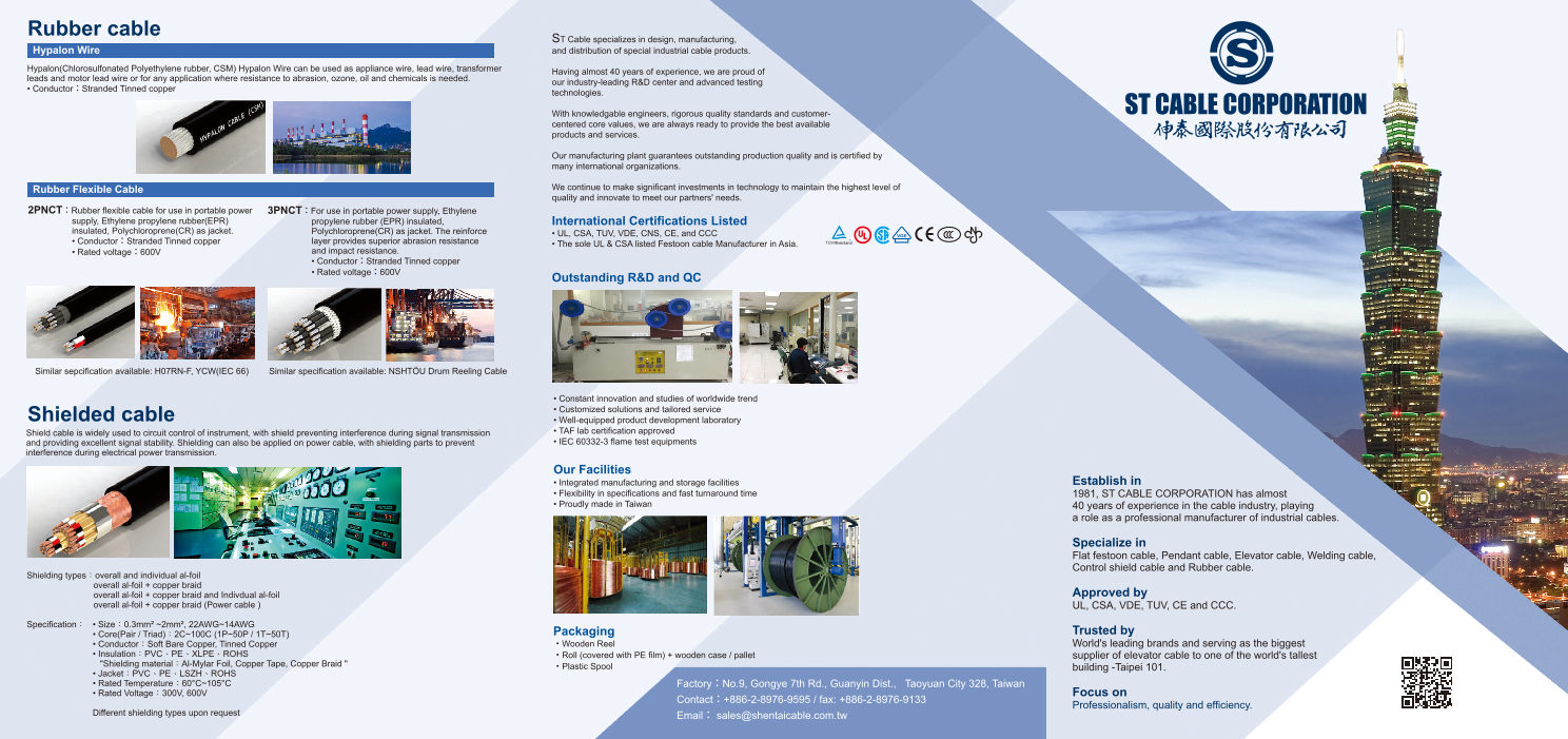 ST Cableは、台湾でISO 9001および14001の認証を受けた35年の経験を持つケーブルメーカーです。UL / VDE認定のラウンド/フラットトラベルケーブル、エレベーターケーブル、クレーンケーブル、ソーラーPVケーブル、シールドケーブルなどの...