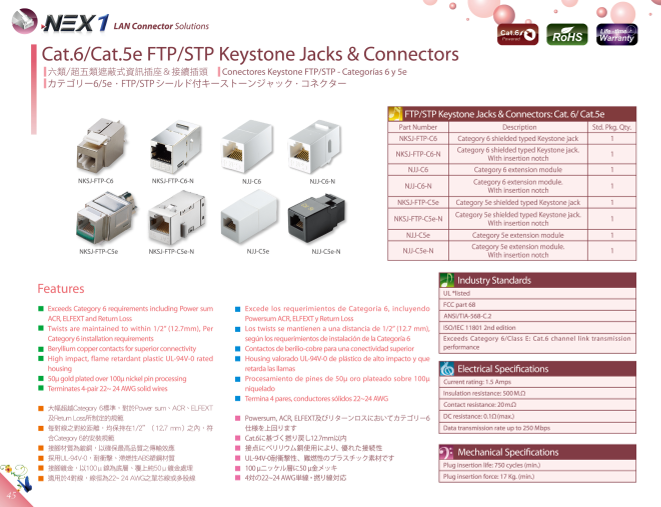 NEX1 Technologies は、台湾のLANケーブル、コネクタ、光ファイバ等のメーカーです。NEX1のシールド付きキーストンジャックは、高品質のネットワーク接続を提供するために設計された信頼性のある製品です。Cat.6およびCat.5e規格に準拠...