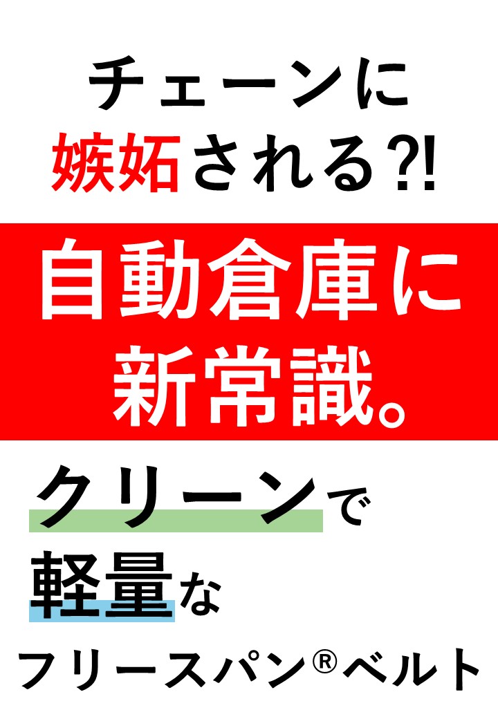 フリースパン®ベルトは、ポリウレタン製タイミングベルトです。歯付きベルトの高精度な位置決め機能と樹脂コンベヤベルトの優れた加工性をあわせ持ちます。大型歯形のフリースパン®ベルトはローラーチェーンからの置換が可能で、高速化、低騒音、無給油を実現できます。