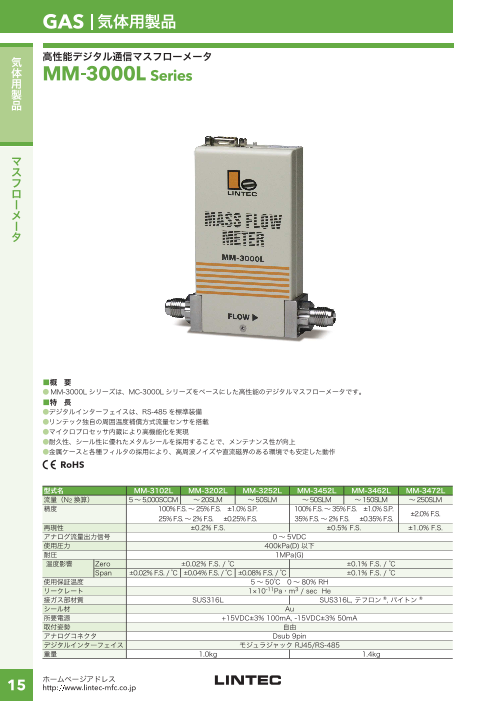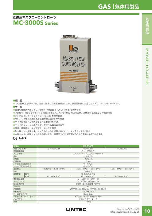 MC-3000L シリーズは、±1.0%S.P. 保証を実現した高性能のデジタルマスフローコントローラです。 ◆±1.0%S.P. 保証を実現。 ◆デジタルインターフェイスは、RS-485 を標準装備。 ◆リンテック独自の周囲温度補償方式流量セ...