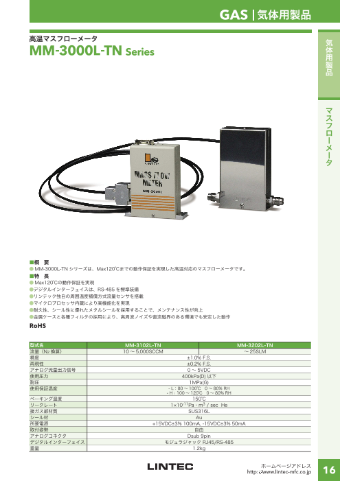 MM-3000L-TNシリーズは、Max120℃までの動作保証を実現した高温対応のマスフローメータです。 ◆Max120℃の動作保証を実現。 ◆デジタルインターフェイスは、RS-485 を標準装備。 ◆リンテック独自の周囲温度補償方式流量センサ...