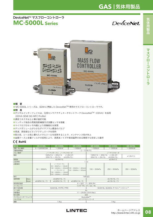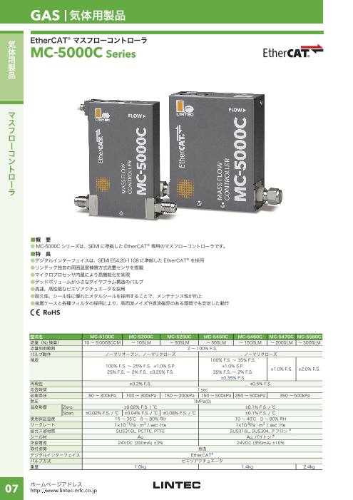 MC-5000Cシリーズは、SEMI に準拠した EtherCAT専用のマスフローコントローラです。 ◆デジタルインターフェイスは、SEMI E54.20-1108 に準拠した EtherCATを採用。 ◆リンテック独自の周囲温度補償方式流量セン...