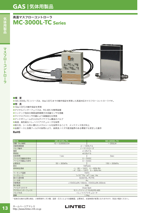 MC-3000L-TCシリーズは、Max120℃までの動作保証を実現した高温対応のマスフローコントローラです。 ◆Max120℃の動作保証を実現。 ◆デジタルインターフェイスは、RS-485 を標準装備。 ◆リンテック独自の周囲温度補償方式流量...