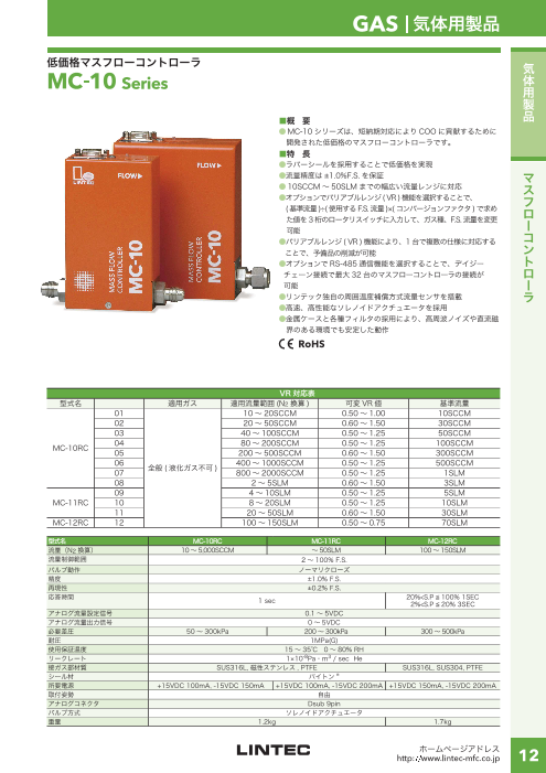 MC-10シリーズは、短納期対応によりCOOに貢献するために開発された低価格のマスフローコントローラです。 ◆ラバーシールを採用することで低価格を実現。 ◆流量精度は ±1.0%F.S. を保証。 ◆10SCCM~50SLM までの幅広い流量レンジ...