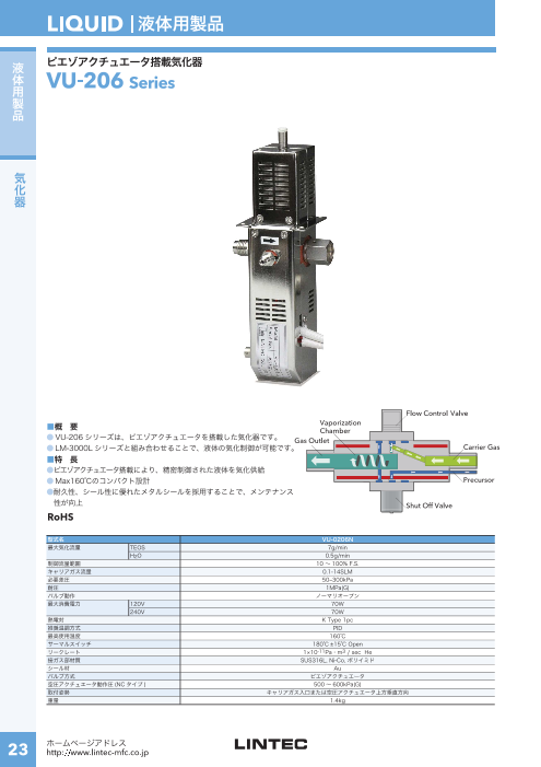 VU-206シリーズは、ピエゾアクチュエータを搭載した気化器です。 ◆LM-3000Lシリーズと組み合わせることで、液体の気化制御が可能です。 ◆ピエゾアクチュエータ搭載により、精密制御された液体を気化供給。 ◆Max160℃のコンパクト設計。...