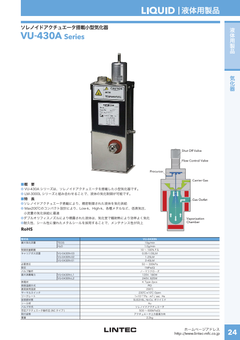 VU-450シリーズは、ソレノイドアクチュエータを搭載した気化器です。 ◆ LM-3000Lシリーズと組み合わせることで、液体の気化制御が可能です。 ◆ソレノイドアクチュエータ搭載により、精密制御された液体を気化供給。 ◆ VU-430Aシリー...