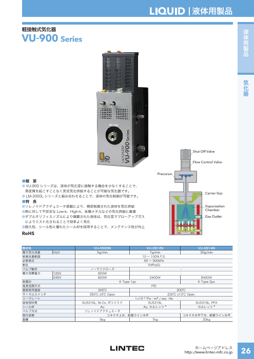 VU-900シリーズは、液体が気化室に接触する機会を少なくすることで、 熱変質を起こすことなく安定気化供給することが可能な気化器です。 ◆LM-3000Lシリーズと組み合わせることで、液体の気化制御が可能です。 ◆ソレノイドアクチュエータ搭載によ...