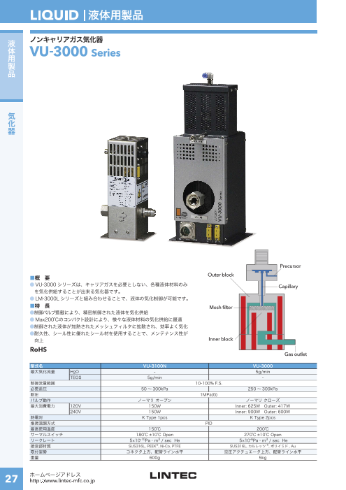 VU-3000シリーズは、キャリアガスを必要としない、各種液体材料のみを気化供給することが出来る気化器です。 ◆ LM-3000Lシリーズと組み合わせることで、液体の気化制御が可能です。 ◆ソレノイドアクチュエータ搭載により、精密制御された液体を...