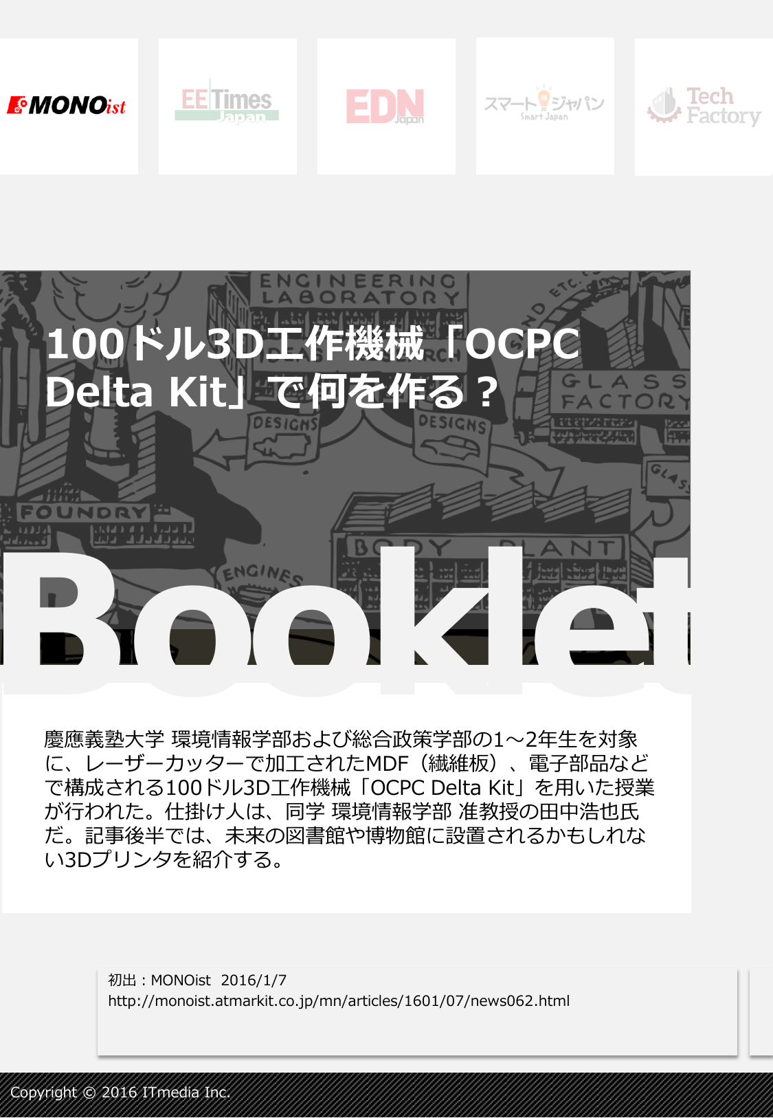 「OCPC Delta Kit」と呼ばれる“3Dプリンタのようなキット”を学生らに配布し、組み立て、動作確認を行った後、それを「個人的に何かの役に立つ工作機械(ロボット)」に仕立て上げるという授業(「デザイン言語実践」の4つの演習のうちの1つ)が、201...