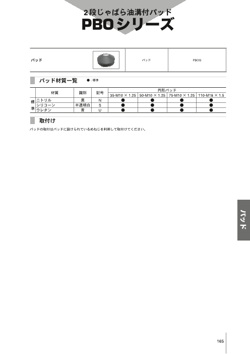 ◆パッドの取付はパッドに設けられているめねじを利用して取付けてください。 ◆パッド径 35-M10 × 1.25 φ 35 50-M10 × 1.25 φ 50 75-M10 × 1.25 φ 75 110-M18 × 1.5 φ 1...