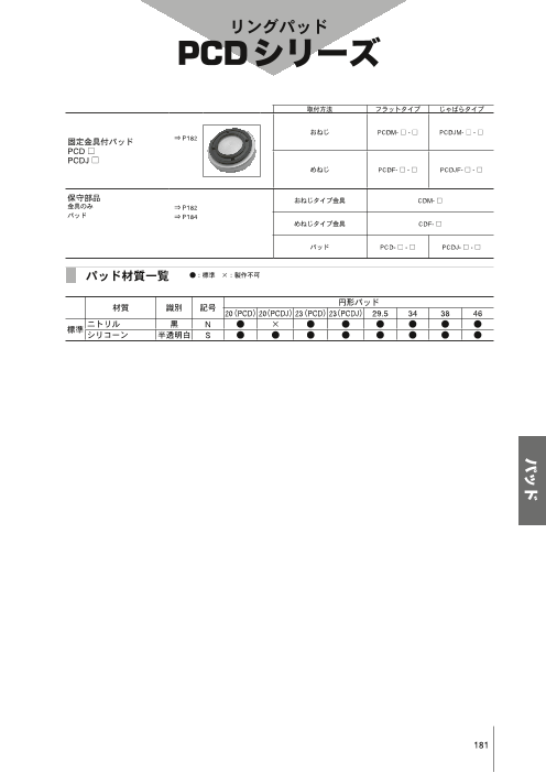 【掲載内容】 ◆リングパッド単体/PCD ◆パッドタイプ PCD:フラットタイプ、PCDJ:じゃばらタイプ ◆パッドゴム材質 N:NBR(ニトリルゴム)、S:シリコーンゴム ◆詳細はカタログをダウンロードしてご覧下さい。