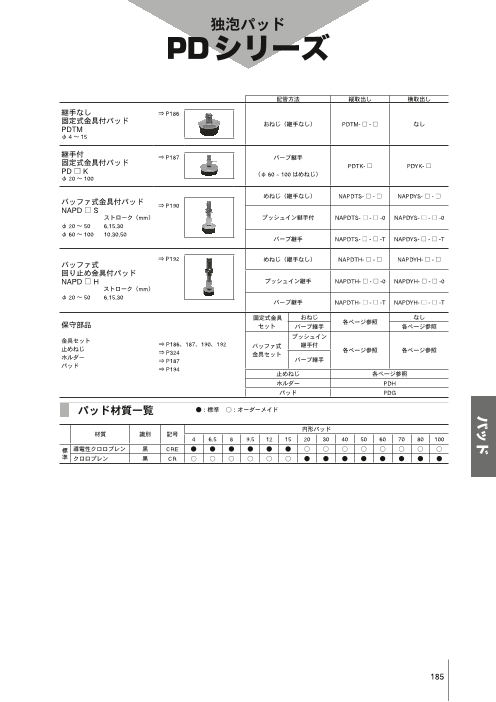 【掲載内容】 ◆継手付固定式金具付パッド/PDTK・PDYK ◆バッファ式金具付パッド/NAPDTS・YS ◆バッファ式回り止め金具付パッド/NAPDTH・YH ◆独泡パッド単体/PDG ◆詳細はカタログをダウンロードしてご覧下さい。