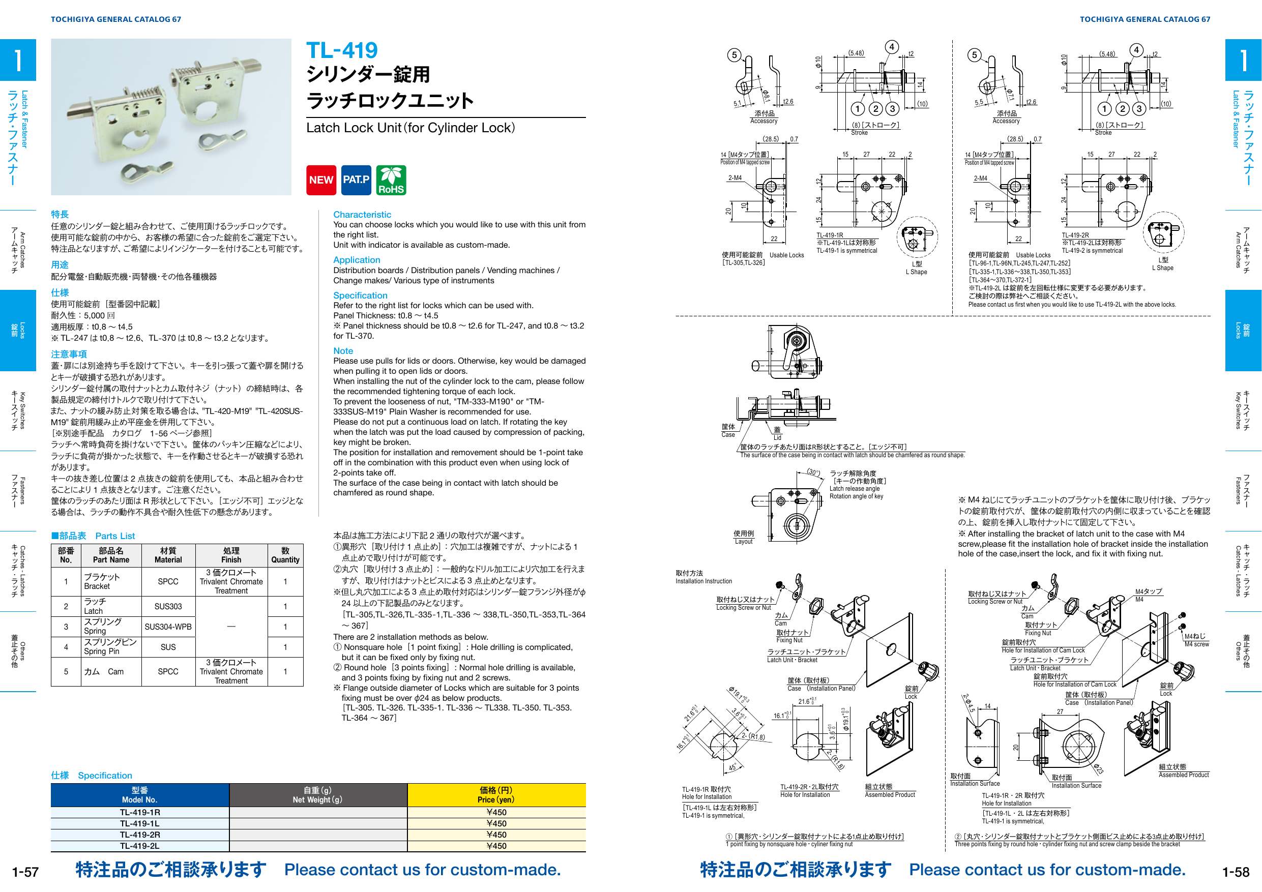 特長 南京錠(TL-285J)用の穴があり、開放状態でもレバーがふらつかない ステンレス製のアームキャッチです。 用途 計測機器・制御盤・分電盤・配電盤・工作機械等 注意事項 緩衝用にパッキン等をご使用ください。 取付の際、相手側に...