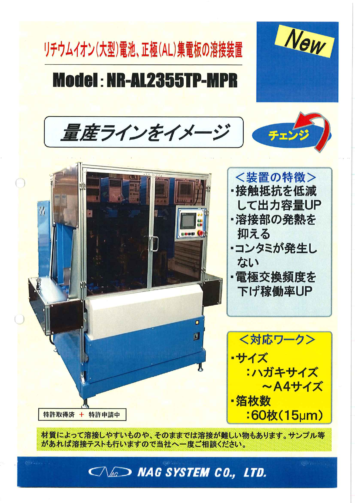 リチウムイオン電池、正極集電板の溶接装置 NR-AL2355TP-MPR カタログの...