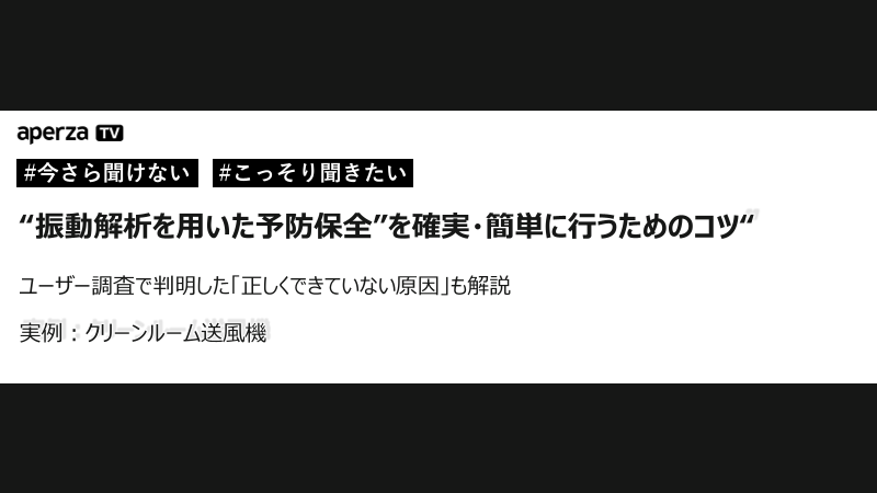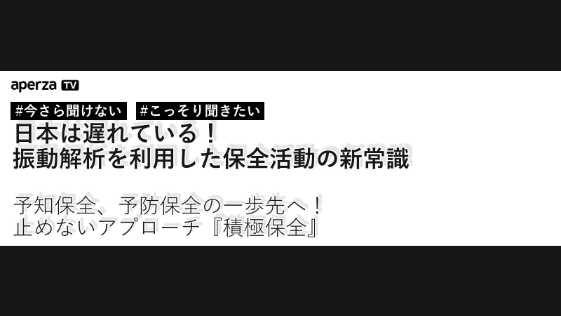 【国際規格の策定にも参加する振動解析のスペシャリスト】プルーフテクニックが、海外では当たり前となりつつある最新の振動解析事情をご紹介。これまで諦めてきたゆっくり回転する機器の故障も含め、止めない、壊さないを目指す『積極保全』のノウハウを公開。 予知保全...