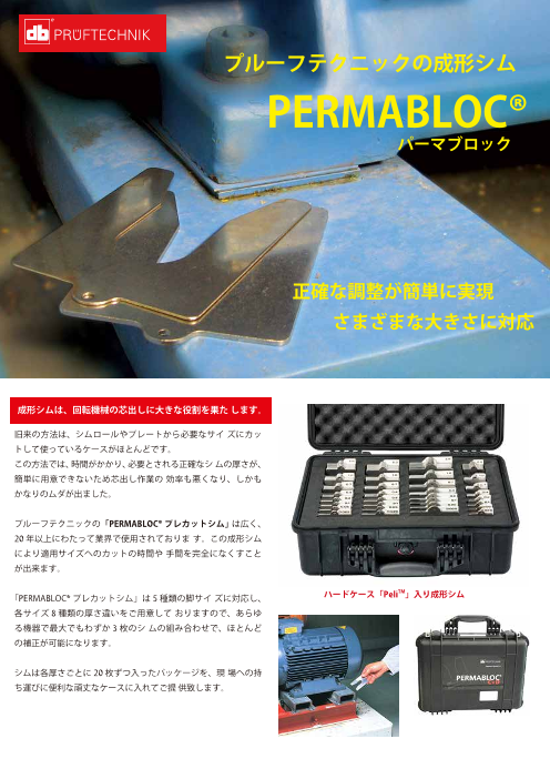 成型シムは、回転機器の芯出しに大きな役割を果たします。プルーフテクニックのPERMABLOC(パーマブロック)は広く20年以上にわたって業界で使用されております。 正確な調整が簡単に実現、さまざまな大きさに対応、あらゆる芯出しに。