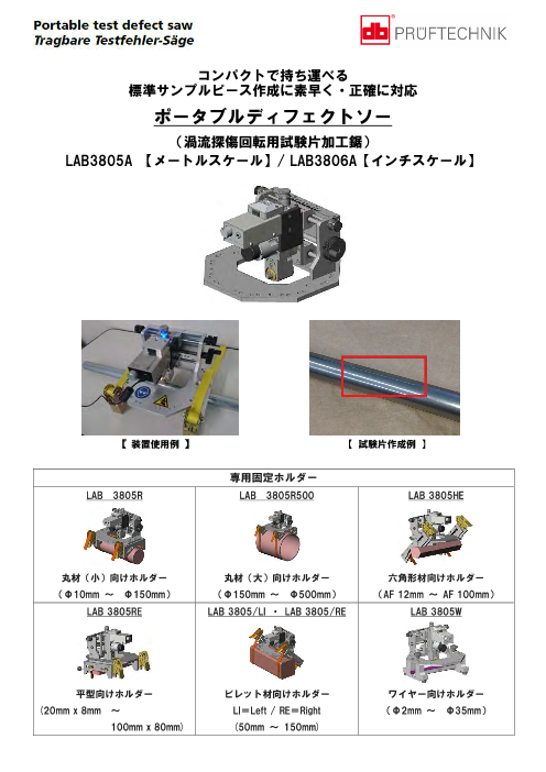 プルーフテクニックのポータブルディフェクトソーはコンパクトで持ち運べ標準サンプルピース作成に素早く・正確に対応 管材・棒材・ワイヤー・ビレット型・ワイヤー等 対象材料の形状に合わせた各種専用固定ホルダーを用意。 ホルダーの取り付け位置を変更し、材料に...