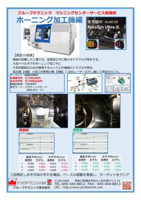 プルーフテクニック製のアライメント機材を使用した実施例 大型ベベルギアのホーニング加工中に大型研磨砥石のみが破損するという工作機械のトラブル発生に対し プルーフテクニックのレーザーアライメントシステムにて砥石軸【A軸】と加工対象物の軸【B軸】の芯出し...