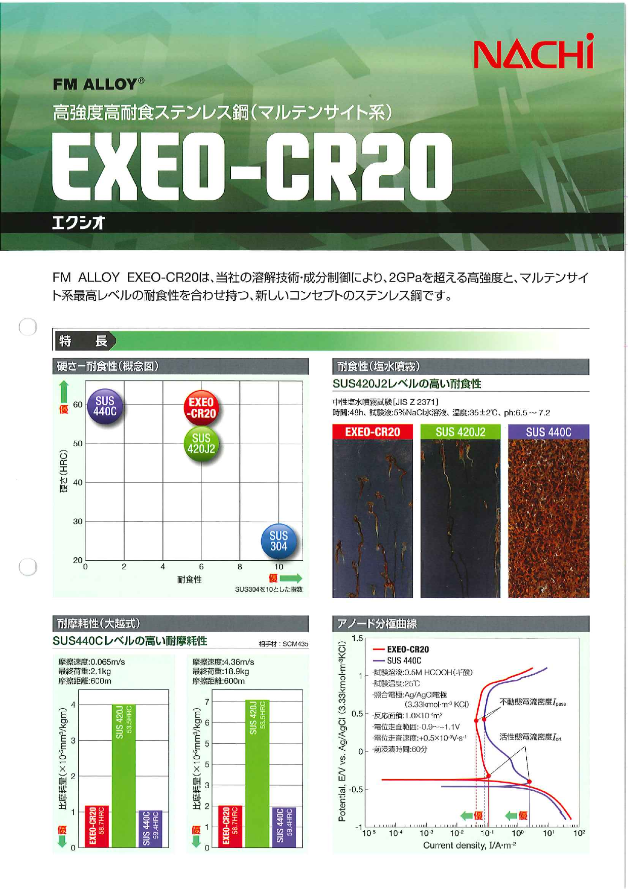 FM ALLOY EXEO-CR20は、当社の溶解技術・成分制御により、2GPaを超える高強度と、マルテンサイト系最高レベルの耐食性を合わせ持つ、新しいコンセプトのステンレス鋼です。