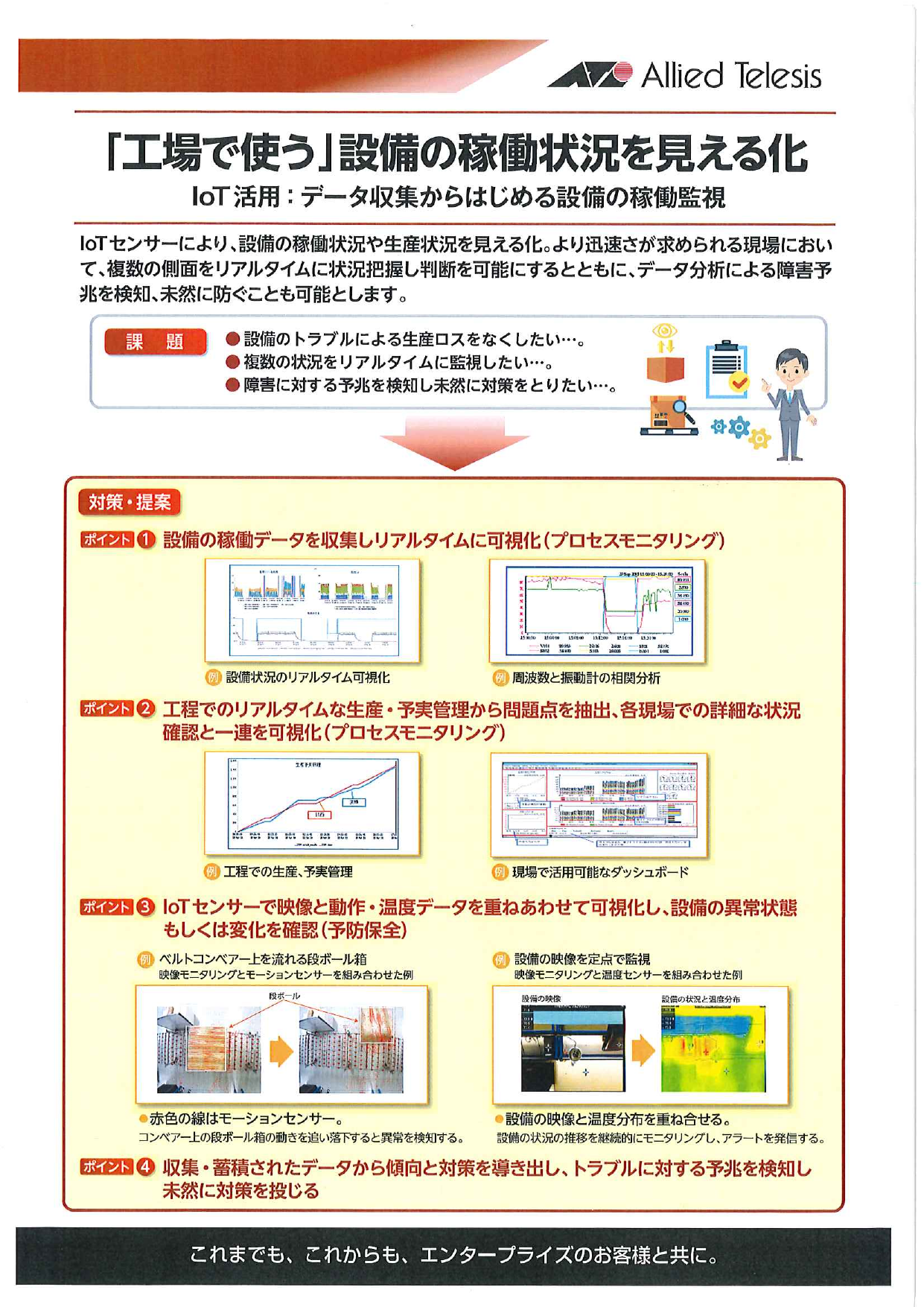 loTセンサーにより、設備の稼働状況や生産状況を見える化。 より迅速さが求められる現場において、複数の側面をリアルタイムに状況把握し 判断を可能にするとともに、データ分析による障害予兆を検知、未然に防ぐことも可能とします。 ◆詳細は、カタログを...