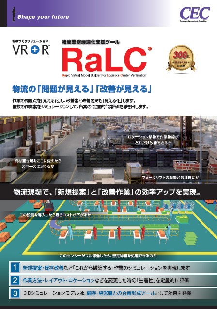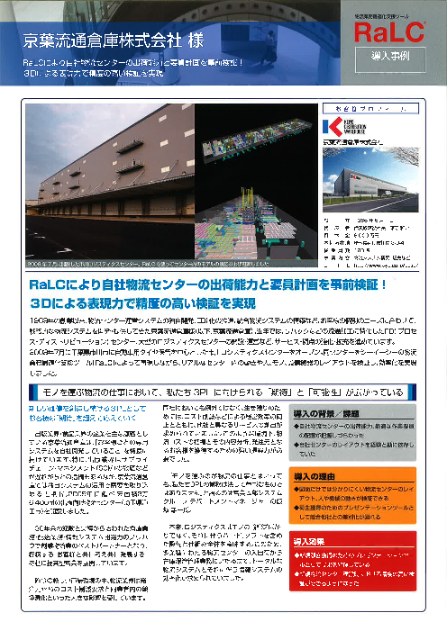物流作業プラン(新センターへの複数の運用プラン、既存センターへの複数の改善プラン)を比較検証し、作業員数・マテハン設備・処理数量・レイアウトが異なる複数プランの能力値を数値化します。 ●特徴 ‐誰でも速く・簡単にモデリング ‐仮想空間を実寸法で...