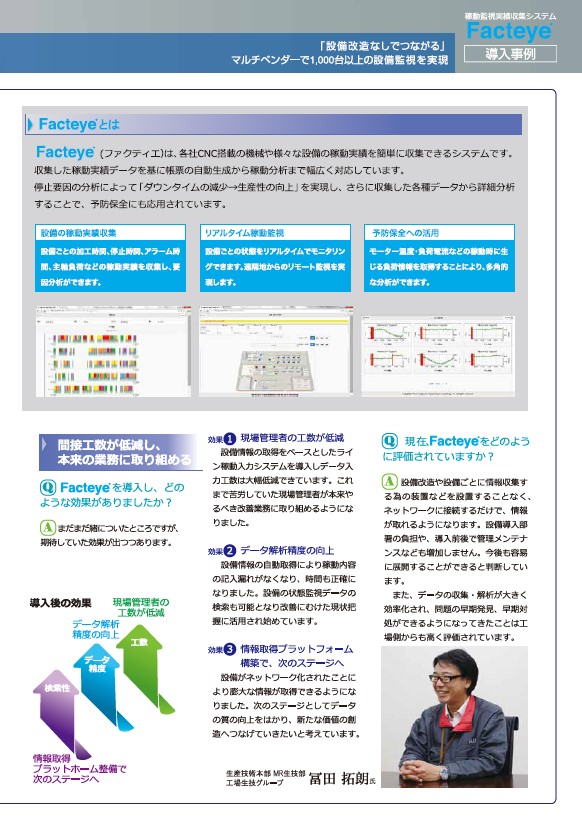特長 ● 設備ごとの加工時間、停止時間、アラーム時間、主軸負荷などの稼働実績を収集し、要因分析が可能。 ● 設備ごとの状態をリアルタイムでモニタリングができ、遠隔地からのリモート監視も実現。 ● モーター温度・負荷電流などの稼働時に生じる負荷情報を...