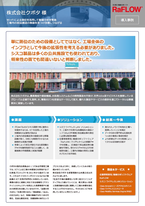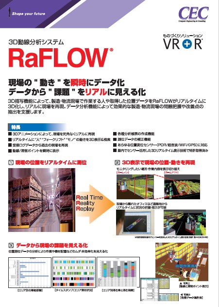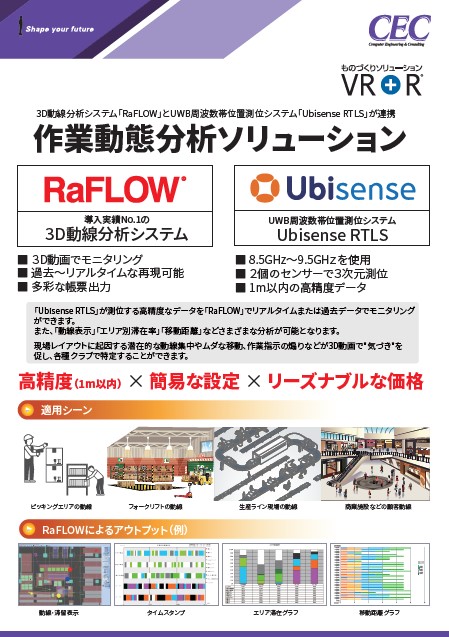 『作業動線分析ソリューション』では、屋内位置・情報探知システム「Picalico」が測位する位置データを、 3D動線表示・分析ソフトウェア「RaFLOW」でリアルタイムまたは過去データでモニタリングできます。 動線表示やエリア別滞在率など様々な分...