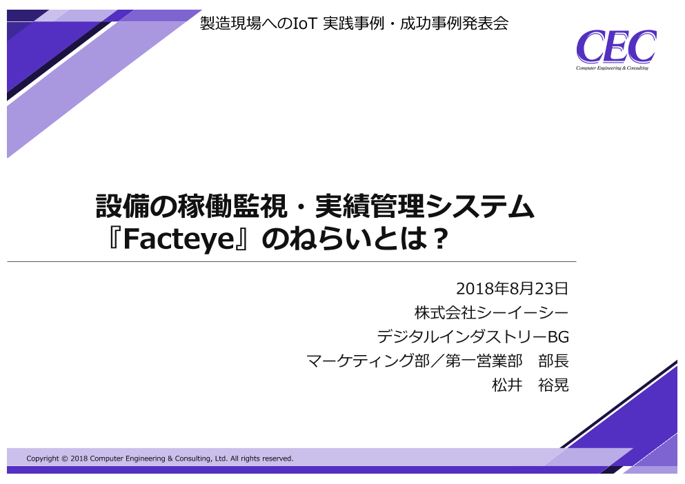 目次 1.シーイーシー概要 2.スマートファクトリー分野のIoT 3.設備のIoT(稼働監視 ) 4.【事例】株式会社日研工作所様 ◆8月23日(木)品川にてアペルザ主催で開催した「製造現場でのIoT 実践事例・成功事例発表会」のセミナー配...
