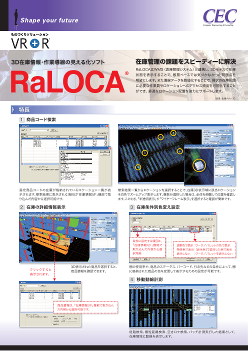 ●特長 ‐最短距離のピッキングルートを自動算出して、最適な動線経路を表示 ‐商品検索機能により在庫の状態、商品の棚位置などを正確に検出 ‐在庫状態を色分けしてビジュアルで表示