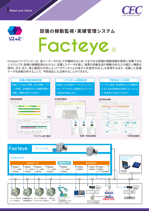 国内主要メーカーのロボット・CNCに幅広く対応し、稼動状況・アラーム情報に基づいた迅速な意思決定と異常の早期発見を支援します。 マルチメーカー対応の設備稼動監視・実績管理システム「Facteye(ファクティエ)」との連携も可能。 ●特徴 ‐設備異...
