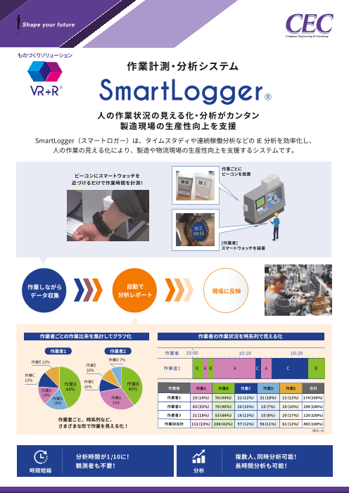スマートウォッチから作業者の動態情報を自動収集し、生産プロセス全体の効率化に向けた「工程分析」・「動作分析」などを進めるお客様の分析作業を効率化します。 ●3つの特長 ‐ スマートウォッチで簡単データ収集 ‐ 課題が見えるレポートでIE分析が楽...