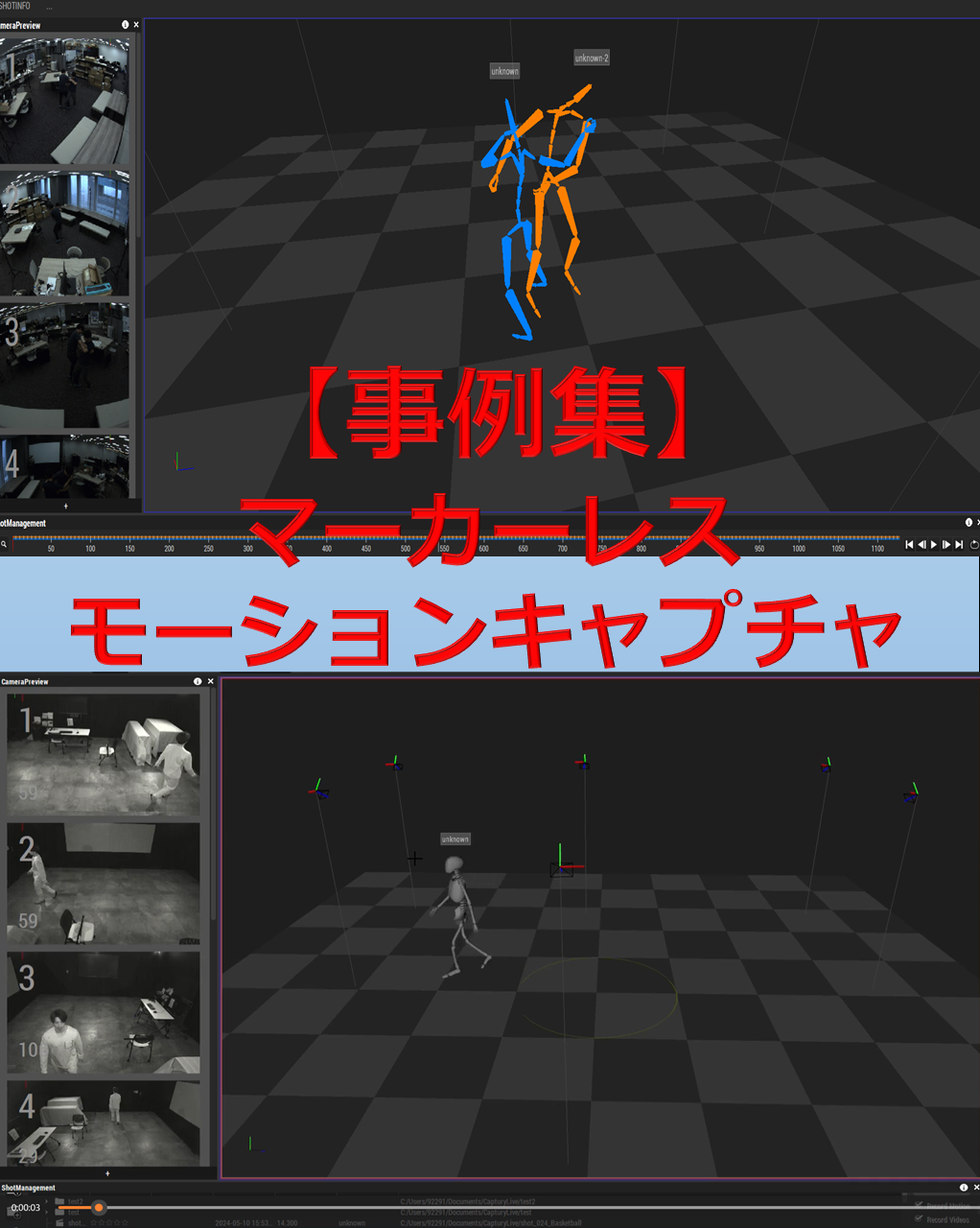 マーカーレスモーションキャプチャ【Captury】の一部事例を公開します。 Capturyとは・・・ ・リアルタイムにマーカーレスでモーションキャプチャが可能なシステムです。 ・複数台のカメラから骨格認識を行うことで、3次元的なトラッキングを実...