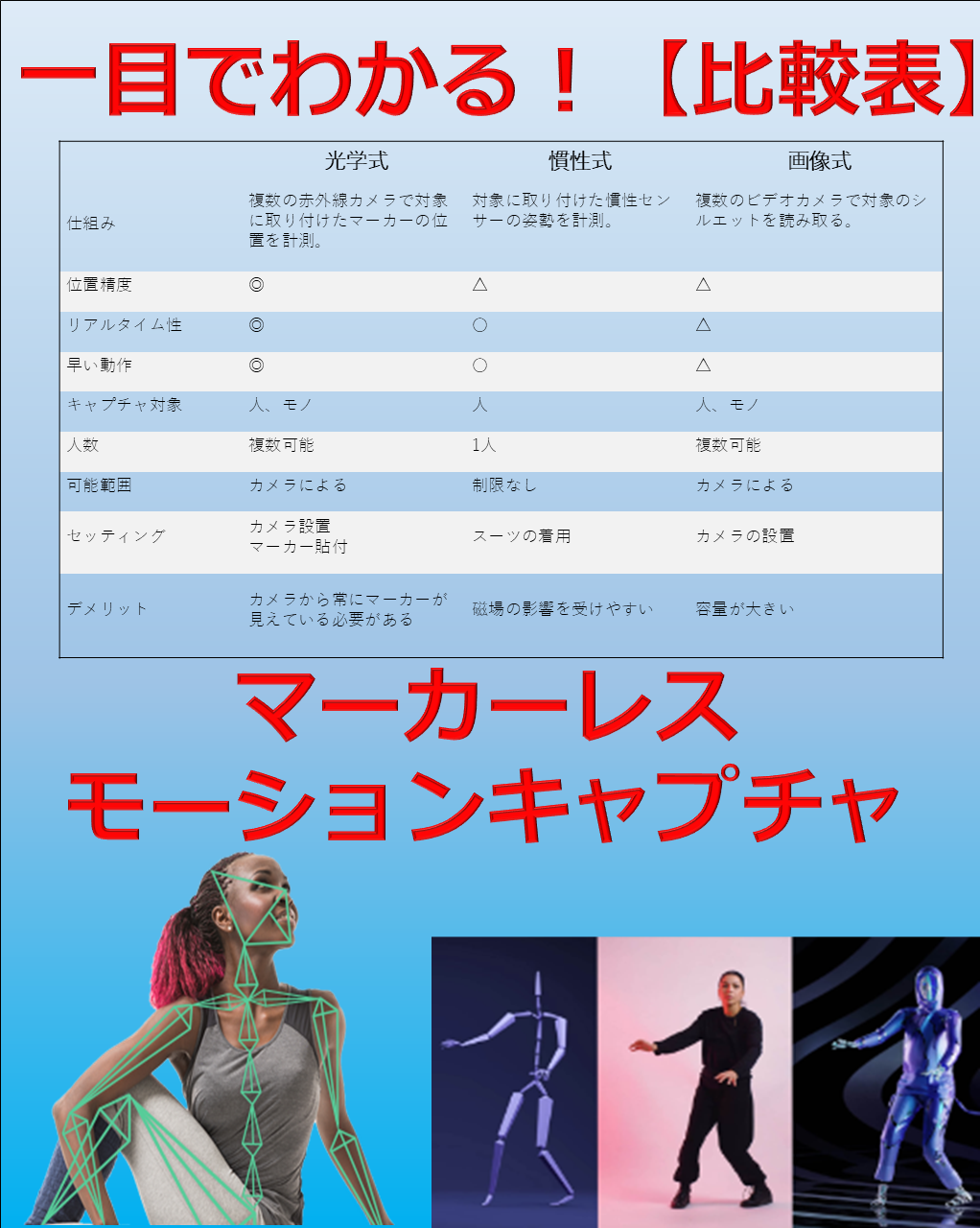 マーカーレスモーションキャプチャ【Captury】と他センサの比較表を公開します。 Capturyとは・・・ ・リアルタイムにマーカーレスでモーションキャプチャが可能なシステムです。 ・複数台のカメラから骨格認識を行うことで、3次元的なトラッキ...