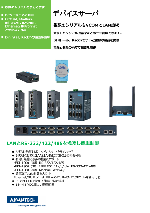LANとRS-232/422/485を橋渡し簡単に制御! ◆シリアル接続は1ポートから16ポートをラインナップ ◆シリアルだけでなくLANとLAN間のプロトコル変換も可能 ◆有線、無線で複数の機器をサポート ・EKI-1200有線RS-232/4...