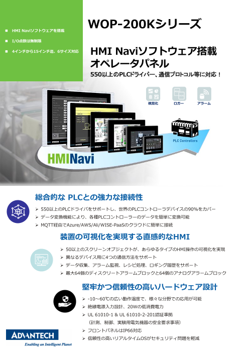 WOP-200K シリーズは、様々なサイズ(4.3インチから15インチ)の液晶ディスプレイが使用できます。WOP-200KシリーズにはアドバンテックのHMINaviソフトウェアが付属しており、HMIアプリケーション用に設計されたヒューマン・マシン・インタ...