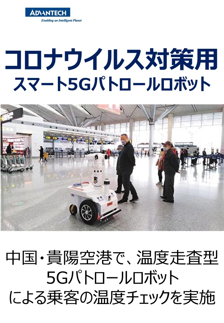 台北(2020年3月) COVID-19の普及阻止の一環として、広州五三ロボット(株)がアドバンテック技術 を用いて開発した5Gパトロールロボットを用いて、公共の場所でのマスク着用や体温をモニターして いる。