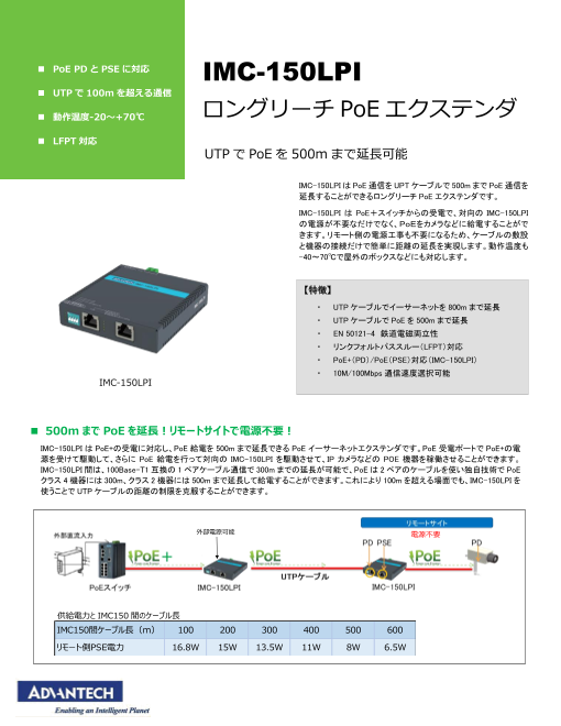 IMC-150LPI は、PoE 通信をUPT ケーブルで500m までPoE 通信...