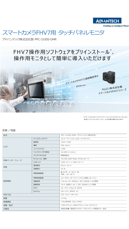 アドバンテックのPPC-3100S-OMRは、スマートカメラFHV7と接続確認済みで、操作用モニタとして簡単に導入いただけます。