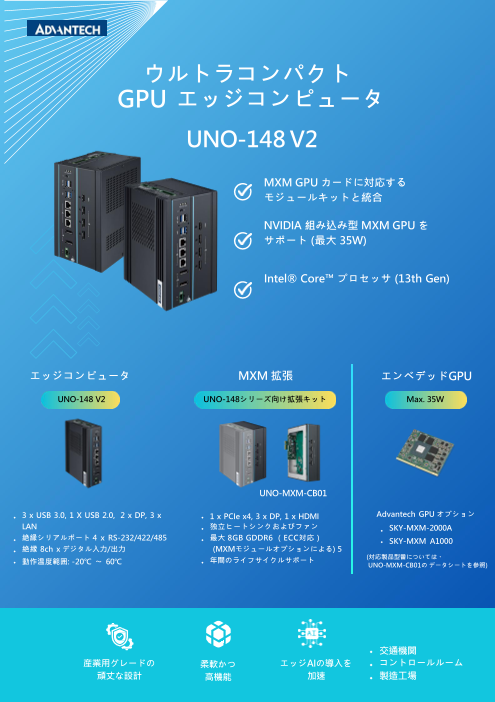 ・MXM GPU カードに対応するモジュールキットと統合 ・NVIDIA 組み込み型 MXM GPU をサポート (最大 35W) ・Intel® Core™ プロセッサ (13th Gen) ・3 x USB 3.0, 1 X USB 2.0, ...
