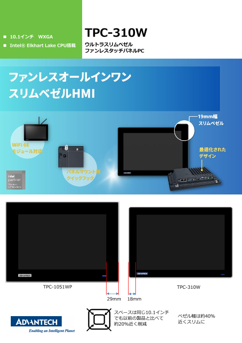 10.1インチ WXGA および インテル® Elkhart Lake CPU を搭載したウルトラスリムベゼルのファンレスタッチパネルPC ・産業用10.1インチWXGA TFT LCD、50K寿命、LEDバックライト搭載 ・インテル® Elkhar...