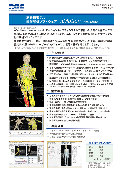 通常の動作解析ソフトウェアのように、関節角度や関節モーメント・関節パワーといった運動学、動力学計算ができるのはもちろん、筋張力・筋活性度といった筋骨格解析も可能な筋骨格モデル動作解析ソフトウェアです。