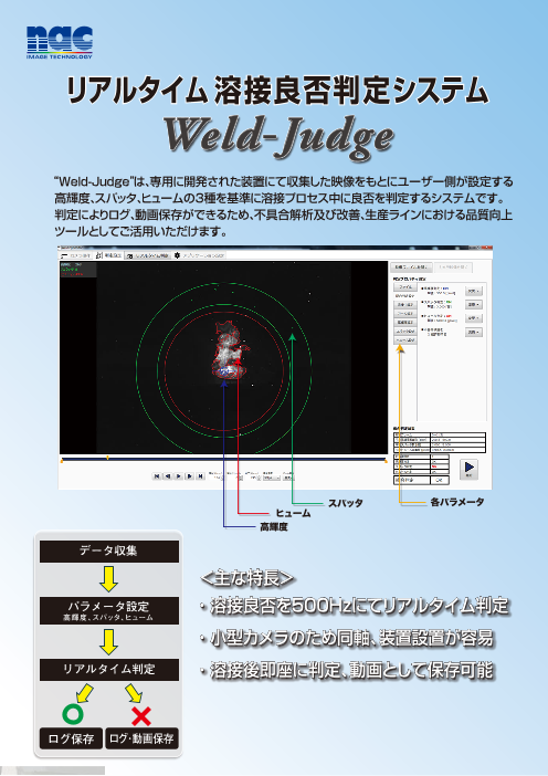 Weld-Judge(ウェルドジャッジ)」は、専用に開発された装置で収集した映像をもとに、ユーザーが設定する高輝度、スパッタ、ヒュームを基準にして溶接プロセス中に良否を判定する装置です。