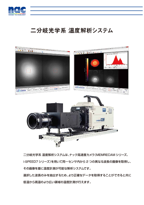 二分岐光学系温度解析システムは、ナックの高速度カメラ(MEMRECAMシリーズ、i-SPEED7シリーズ)を用いて同一センサー内から2つの異なる波長の画像を取得し、その画像をもとに温度計測が可能な解析システムです。選択した波長のみを抽出するため、より正確...