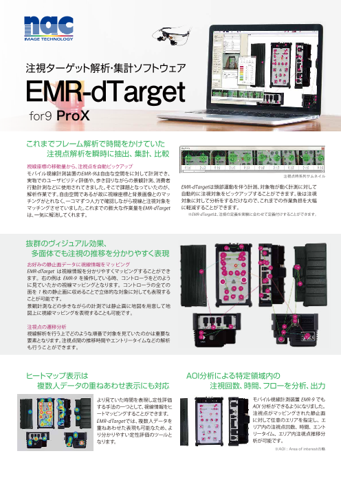 アイトラッキング装置EMR-9で計測したデータの注視点解析を行うソフトウェアです。注視した対象をサムネイルで表示したり、ヒートマップ表示が可能です。 ≪アイトラッキングのデータ解析を体験するチャンス!EMR-dTarget無償体験版のご案内> ア...